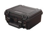 Wasser- und staubdichter Koffer in schwarz, wahlweise mit Schaumstoffeinlagen mit Würfelstanzung zur individuellen Anpassung. Innenmaß: 235 x 180 x 106 Tiefe Deckel+Boden: 25 + 81 mm Aussenmaß: 258 x 243...
